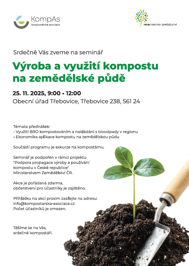 Seminář "Výroba a využití kompostu na zemědělské půdě" přinese témata, jako využití BRO kompostováním a regionální nakládání s bioodpady nebo ekonomika aplikace kompostu na zemědělskou půdu. Součástí programu je exkurze na kompostárně. Akce se koná 25. listopadu v Třebovicích.
